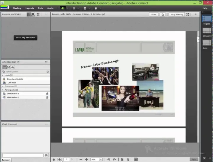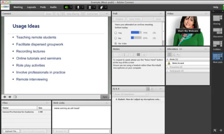 Una plataforma, usos ilimitados. Las salas de Adobe Connect son personalizables y persistentes, por lo que se pueden usar para prácticamente cualquier caso de uso.