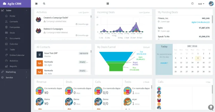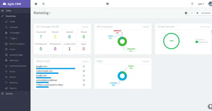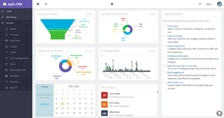 Agile CRM es un software excelente para ventas y mercadeo que reúne mercadeo automatizado, telefonía, soporte, servicio we, integración RRSS, email marketing y mercadeo por SMS.