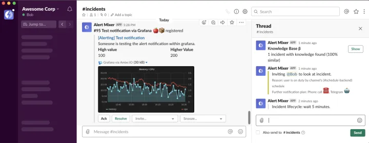 Amixr es una plataforma de gestión de incidentes con una brillante integración de Slack. La plataforma le permite optimizar canales, destinatarios y contenido para aumentar la velocidad de resolución de problemas de TI.