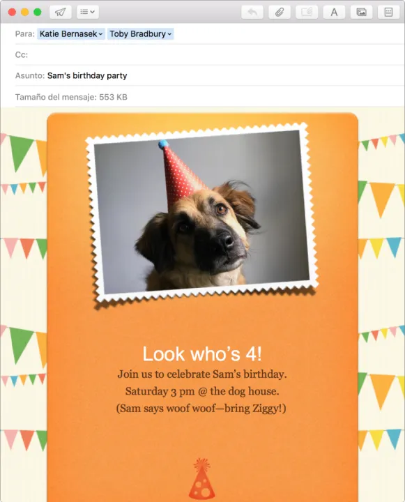 Al usar Mail en pantalla completa, los mensajes se abren en Split View, al lado de la lista de mensajes. Puedes verlo todo sin tener que cambiar de ventanas. Mail ofrece temas de plantillas que te permiten personalizar los mensajes fácilmente. Con Mail es muy fácil encontrarlo: basta con que escribas lo que buscas en el campo de búsqueda. “Mejores resultados” muestra los mensajes más importantes en primer lugar. Si piensas volver a buscar el mismo conjunto de mensajes en el futuro, puedes guardar tu búsqueda para encontrar esos mensajes más fácilmente la próxima vez.