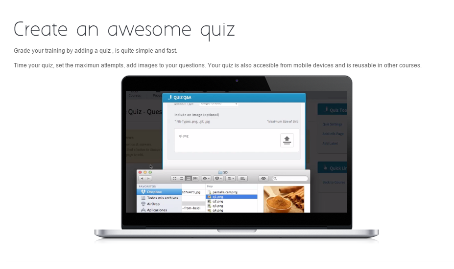 Crea fácilmente cursos y convierte archivos y presentaciones en objetos de aprendizaje a los que se puede acceder desde dispositivos móviles y de escritorio. Elija qué cuestionarios impactan la calificación general y cuáles son para la práctica.