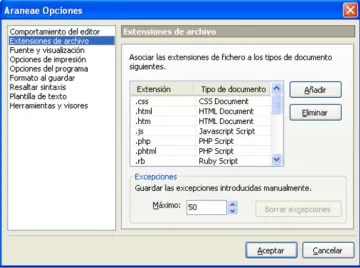 Araneae te brinda Resaltado de sintaxis,soporte para HTML, XHTML, CSS, JavaScript, PHP, Ruby y más.Una vista previa inmediata del navegador, incluso sin guardar te permite insertar clips rápidos personalizables,te da una interfaz multi-documento con pestañas.Y soporte de arrastrar y soltar para archivos e imágenes.