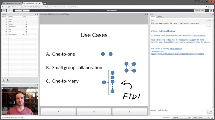 - Herramientas a medida para profesores BigBlueButton le permite compartir su audio, diapositivas, chat, video y escritorio con los estudiantes. Los sondeos integrados facilitan la participación de los estudiantes y la grabación de sus clases significa que puede ponerlos a disposición para su posterior revisión.