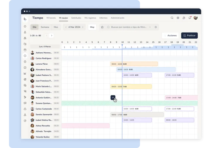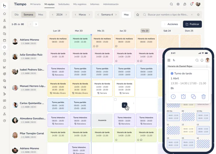 El módulo de turnos te permite tener a tu equipo coordinado desde cualquier lugar, monitoriza sus horas trabajadas y notifícales cualquier cambio al instante.