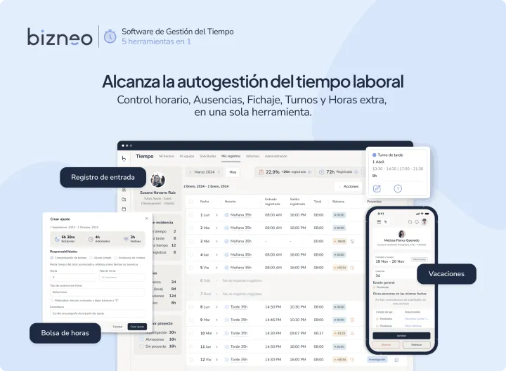 Bizneo Gestión del Tiempo es un software que integra 5 soluciones clave en tu empresa: registro de horas trabajadas, vacaciones y ausencias, turnos de trabajo, control de presencia y acceso, y gestión de horas extra. Todo en una única herramienta.