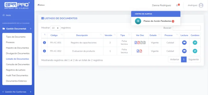 Cuenta con los módulos: Gestión Documental, Gestión de No Conformes (CAPAS y Planes de Acción), PQRS, Indicadores de Gestión, Analisis de Riesgos, Controles de Cambios, Capacitaciones, entre otros.