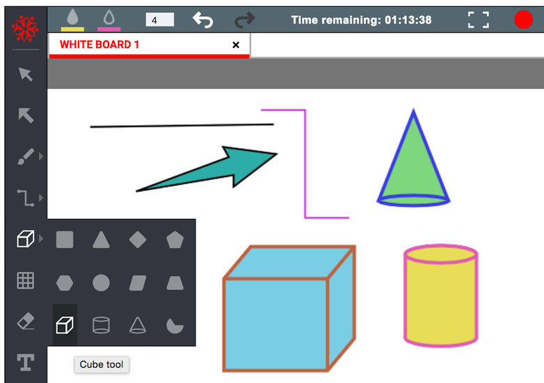 HERRAMIENTAS Y FORMAS DE LÍNEA Las poderosas herramientas de línea y las formas avanzadas como el triángulo, el rombo, el pentágono, el hexágono, el cilindro, el cubo, el cono y otras formas en la pizarra facilitan la entrega de cualquier tipo de capacitación creativa y educativa en línea.
