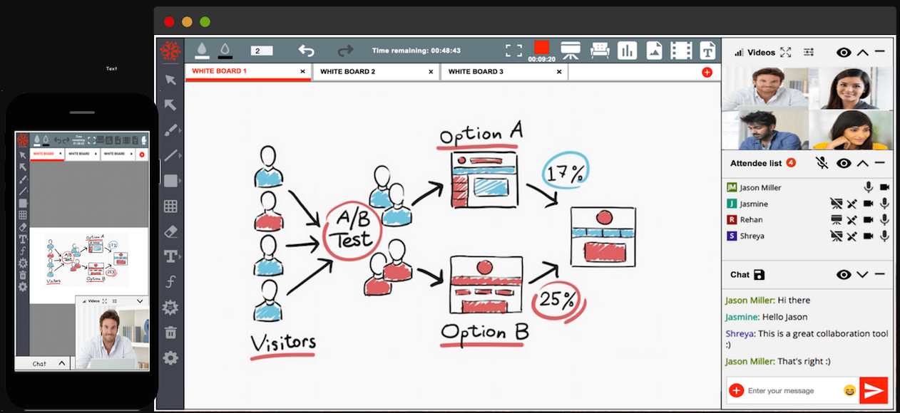 APOYO MÓVIL / TABLETA Únase a las sesiones de Virtual Classroom desde dispositivos basados en Android y Apple iOS usando un navegador compatible sin instalar ninguna aplicación. Soporte completo para conferencias de audio y video basadas en WebRTC y una experiencia de pizarra interactiva. Vea esta Nota de KB para detalles de soporte del navegador.