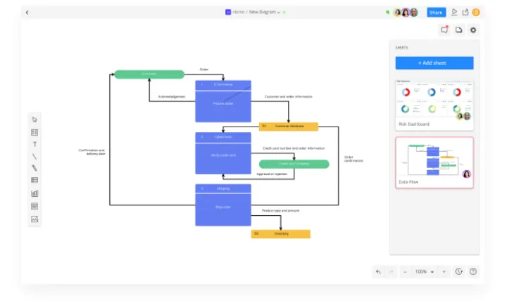 La gran diversidad en la biblioteca de plantillas y formas de Cacoo ofrece las posibilidades que necesitas para crear diagramas de flujo, modelos alámbricos, diagramas de red, organigramas y más. También puedes importar imágenes y capturas de pantalla con tus propios activos para pulir tus diseños. Al visualizar tu proceso, es más fácil de entender, mejorar y comunicarte con los demás. Los diagramas son una forma muy eficaz de transformar lo que está en tu cabeza en una idea fácilmente compartible.