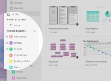 Administración de archivos simple y segura. Mantén a los miembros del equipo organizados con carpetas de proyecto compartidas, cada una con sus propios ajustes de seguridad y miembros. Los cambios se guardan directamente en Cacoo, lo que permite a todos los miembros del equipo crear, editar y compartir diagramas en línea con facilidad.