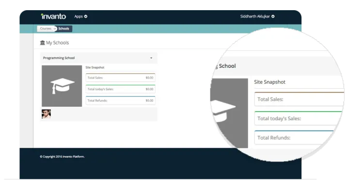 Coachrack ofrece un tablero central para acceder a sus escuelas en línea, donde puede verificar las ventas y las estadísticas de cualquier escuela sin siquiera abrirla. Obtenga información sobre los mejores cursos, los estudiantes mejor pagados y el pronóstico de ingresos a través del panel de ventas.