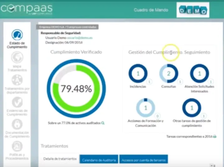 Compaas es un software desarrollado por UBT Legal & Compliance diseñado para la gestión del cumplimiento normativo en los ámbitos tanto de privacidad y protección de datos como en lo que tiene que ver con la prevención de las responsabilidad penal de la persona jurídica y el cumplimiento normativo. Es un sistema versátil e innovador, con la capacidad de adaptarse a las características, sector y actividades de cada organización, permitiendo conocer a todo momento el nivel de riesgo y el grado de cumplimiento de la empresa, esto por medio de su cuadro de mando. La herramienta está especialmente diseñada para la implementación de Sistemas de Gestión basados en las normas UNE 19601, UNE-ISO 37001, UNE 19602 y UNE-ISO 19600.