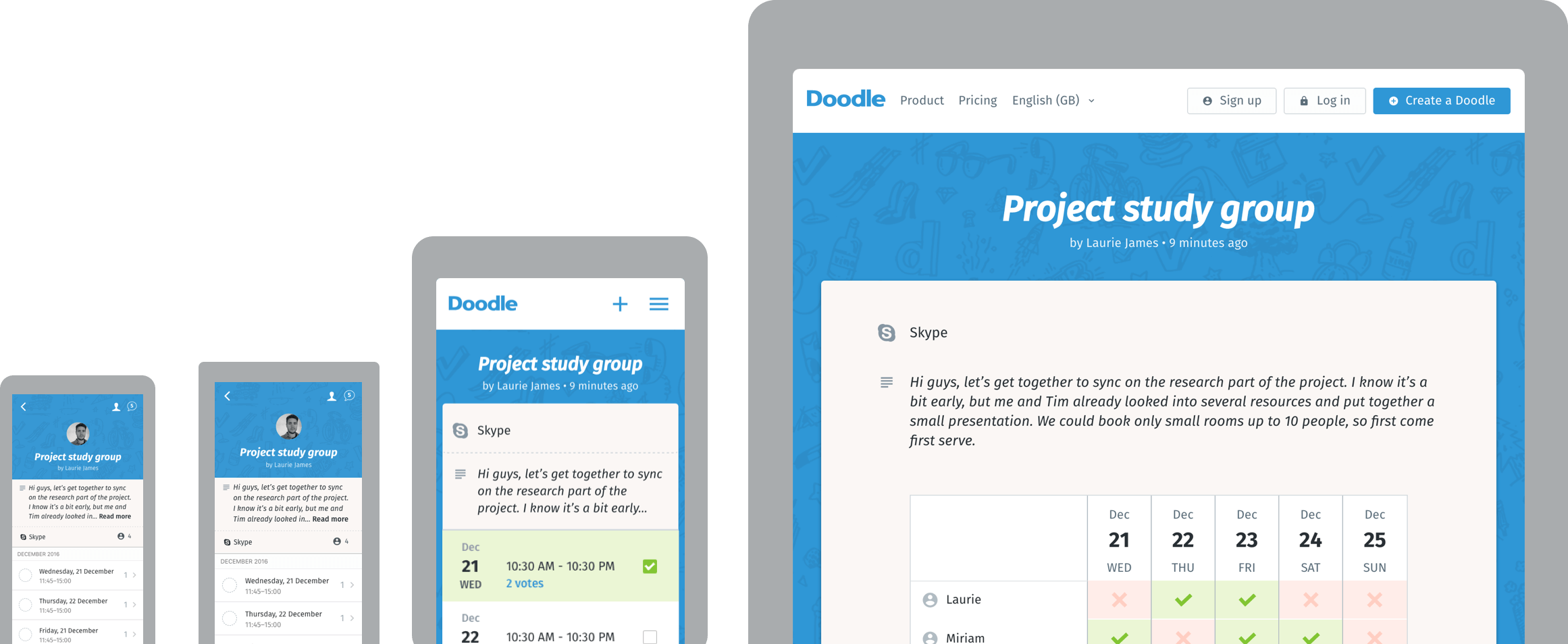 Doodle Software Encuestas sigue en directo tus encuestas,recibe notificaciones sobre la actividad. La aplicación gratuita de Doodle funciona perfectamente en los principales dispositivos.sin anuncios te brindamos una experiencia limpia y sin publicidad a ti y a tus participantes,sin anuncios.