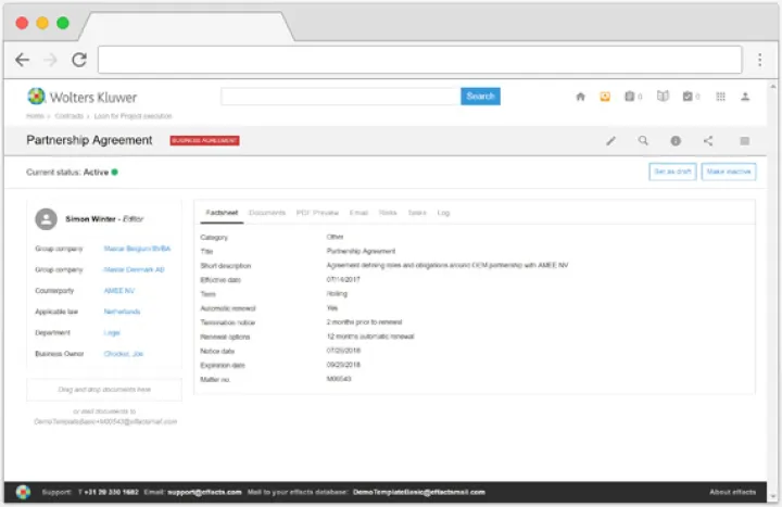 El primer paso para digitalizar la administración de contratos es obtener todos sus contratos en un solo lugar, para proporcionar al negocio una fuente única de verdad. Diga adiós a las hojas de cálculo actualizadas manualmente y ahorre tiempo buscando información del contrato con Effacts Administración Contratos.