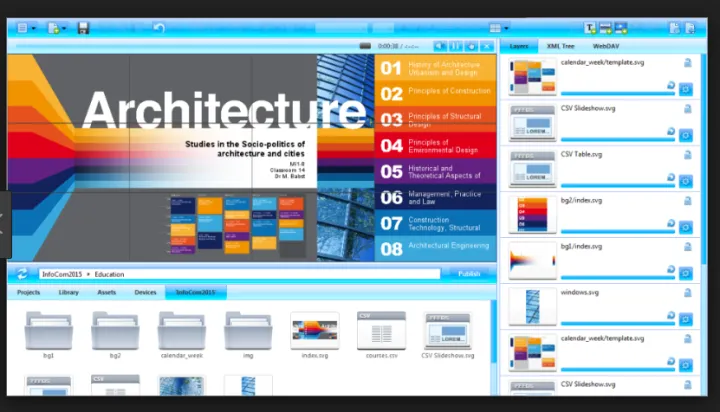 Elementi es un software de cartelería digital simple pero potente, con Elementi ofrecerá una experiencia visualmente rica a cualquier combinación de pantallas en todas sus redes, podrá crear proyectos de alto impacto que incluyan paredes de video, kioskos interactivos y video en vivo. Siempre está a un clic de distancia de la vista previa de cualquier proyecto de señalización digital en pantalla completa ya un clic de publicarlo directamente en todos los HMP.