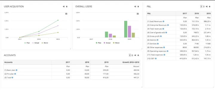 Los datos reales pueden (y deben) compararse con los valores del plan en cualquier momento. También es posible rastrear múltiples versiones de planes simultáneamente: el usuario define la cantidad de variaciones de planes diferentes.
