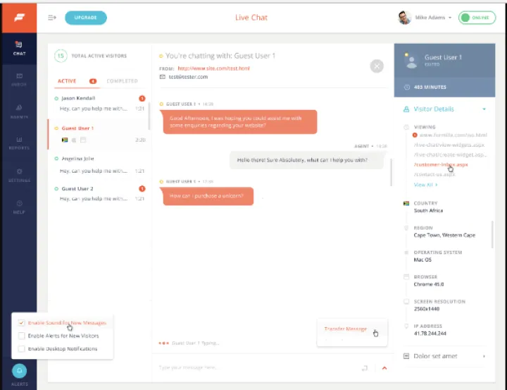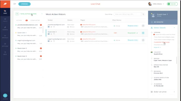 Vea el tráfico de su sitio web en tiempo real y en qué país y región se encuentran sus visitantes. Vea qué páginas web han visitado, cuánto tiempo han estado en su sitio y qué navegador y sistema operativo están usando. ¡Solicita chats con los visitantes en tu sitio web!