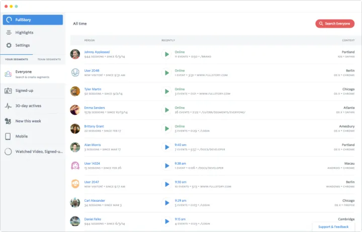 FullStory adopta un enfoque fundamentalmente diferente para comprender la experiencia del cliente. Una pequeña secuencia de comandos desbloquea la reproducción perfecta de píxeles, las estadísticas automáticas, el análisis de embudos y la búsqueda y segmentación sólidas, todo sin la necesidad de etiquetar manualmente el código de su sitio.