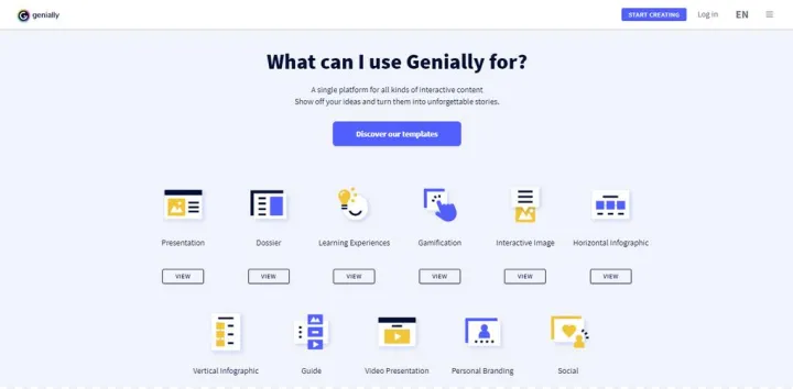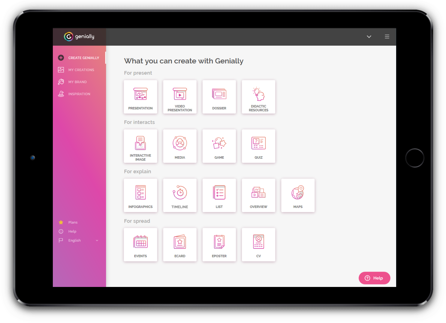 Genially es el líder mundial en comunicación visual interactiva. Utiliza Genially como tu herramienta online todo en uno para crear impresionantes presentaciones, imágenes interactivas, infografías, dossiers, gamificación, currículums y mucho más. Enriquécelos con interactividad y efectos de animación en cuestión de segundos.