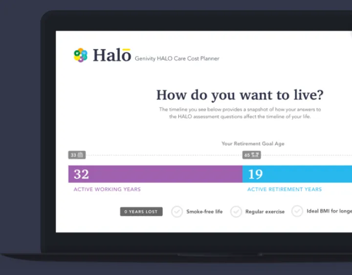 HALO lleva la ciencia a la planificación financiera para crear proyecciones personalizadas sobre los costos de atención y salud de sus clientes. Incrusta HALO en tu sitio web y aliente a sus clientes a realizarse una evaluación gratis cada vez que tengan unos minutos disponibles.