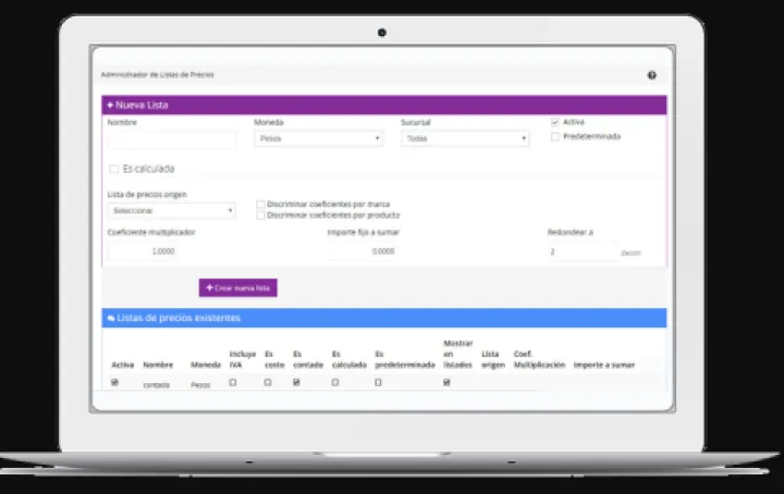 - Administración de productos y múltiples listas de precios con valores definidos o calculados.