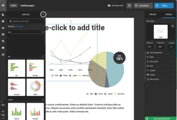 Infogram Software de Visualización de Datos integra más de 35 gráficos interactivos y más de 550 mapas para ayudarlo a visualizar datos, incluidos gráficos circulares, gráficos de barras, tablas de columnas y nubes de palabras.