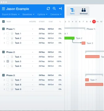 - Dependencias y gestión de la carga de trabajo : el software de gráficos de Gantt tiene una función de dependencias que permite a los usuarios alinear mejor sus planes de proyecto, cuando se realizan cambios en una tarea con dependencias, el resto de las tareas en el gráfico se ajustan automáticamente.