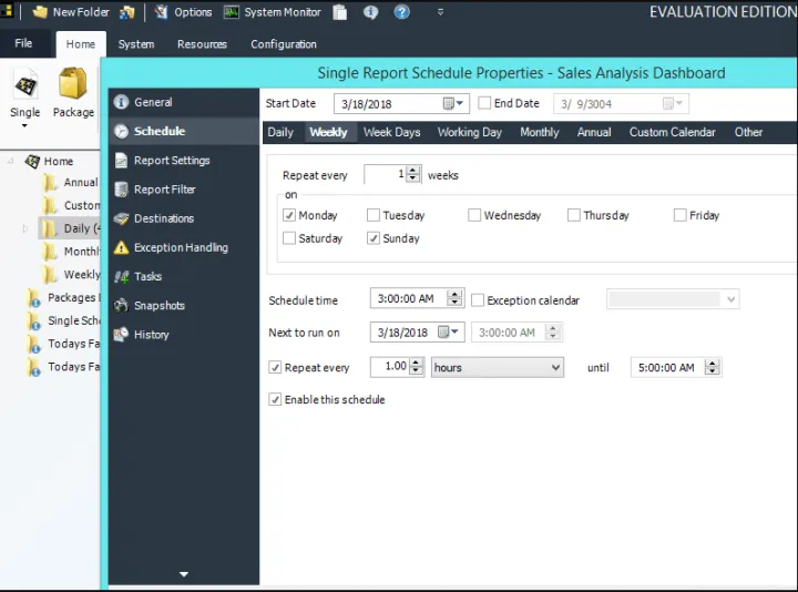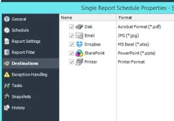Simplemente configure una “programación” que indique la frecuencia con la que desea que se ejecute cada informe, si desea obtener el resultado en formato Word, Excel, HTML, PDF, PowerPoint, Jpeg, etc. y a quién debe enviarse. PBRS hará la entrega automatizada por usted, entregando informes a la carpeta, correo electrónico, impresora, Dropbox, SharePoint y FTP.