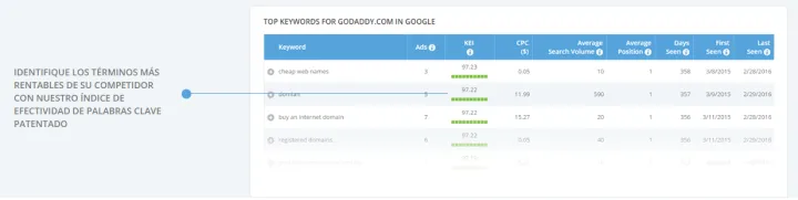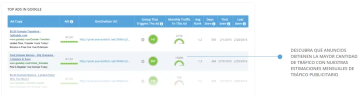 iSpionage identifica a sus principales competidores de AdWords y revela su presupuesto mensual aproximado y toda la estrategia de PPC. Puede utilizar esta información para desconectar el ruido, identificar a los verdaderos anunciantes principales en su espacio y aprender de los mejores en su industria.