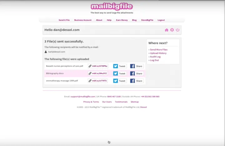 MailBigFile permite al usuario enviar archivos grandes de hasta 20 GB de tamaño a través de Internet. Al utilizar este sistema, puede eludir cualquier límite que pueda imponer su sistema de correo electrónico.