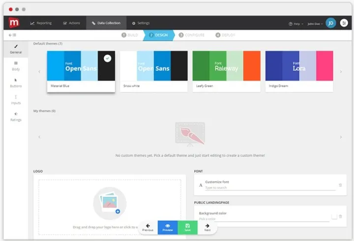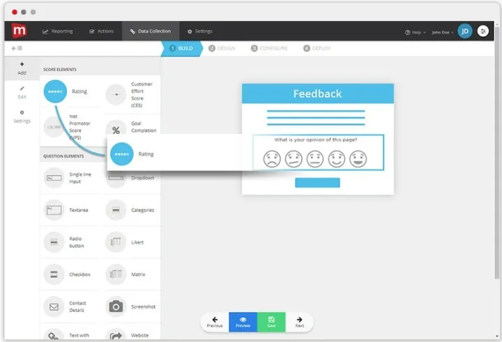Cree sus propios formularios de comentarios con diversos elementos de demanda, tales como opciones múltiples, comentarios abiertos y varios puntajes de comentarios.