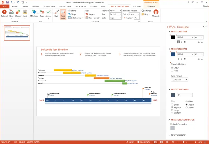 Este software de gestión de proyectos posee una interfaz sencilla e intuitiva, fácilde usar y práctica quemantendrá su equipo y sus proyectos en orden y al día..Con Office Timeline crear líneas de tiempo profesionales y diagramas de Gantt nunca ha sido tan fácil. La perfecta integración en PowerPoint y un poderoso pero simple Asistente para el creador de la línea de tiempo significa que puede comenzar a crear gráficos y líneas de tiempo de Gantt de gran apariencia en minutos.
