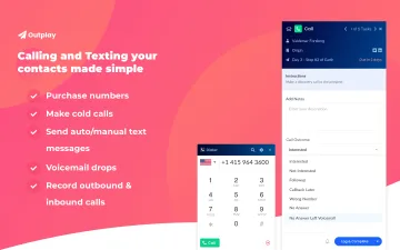 Participe en conversaciones genuinas a escala y obtenga información para impulsar el crecimiento de los ingresos con Outplay. Somos la plataforma de compromiso de ventas de la nueva era y la única herramienta que su equipo de ventas necesitará para aplastar sus objetivos. Más fácil de usar, interfaz intuitiva Soporte gratuito las 24 horas del día, los 7 días de la semana Soporte gratuito de incorporación para el éxito Alcance multicanal (correo electrónico, llamada, Sms, Linkedin) Automatización integrada para ahorrar tiempo Integraciones con Salesforce, Pipedrive, Office 365, Crelate