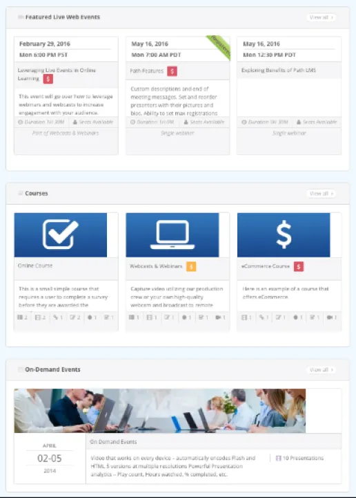 Path LMS le permite llevar un registro simple para próximos seminarios web, eventos híbridos y transmisiones web en vivo. Agregue descripciones, biografías de los oradores, fotos y recursos. Además, evalúe la aptitud de su audiencia diseñando sus propias pruebas para evaluar a los estudiantes. Emita certificados de marca personalizados a medida que los alumnos completan los cursos.