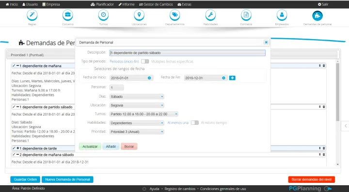 PGPlanning es una plataforma cloud para la elaboracion de turnos de trabajo. Con su calculadora automática, podrás generar los cuadrantes de trabajo de cada trabajador incluyendo todas las reglas , restricciones y demandas de personal para cubrir el servicio.