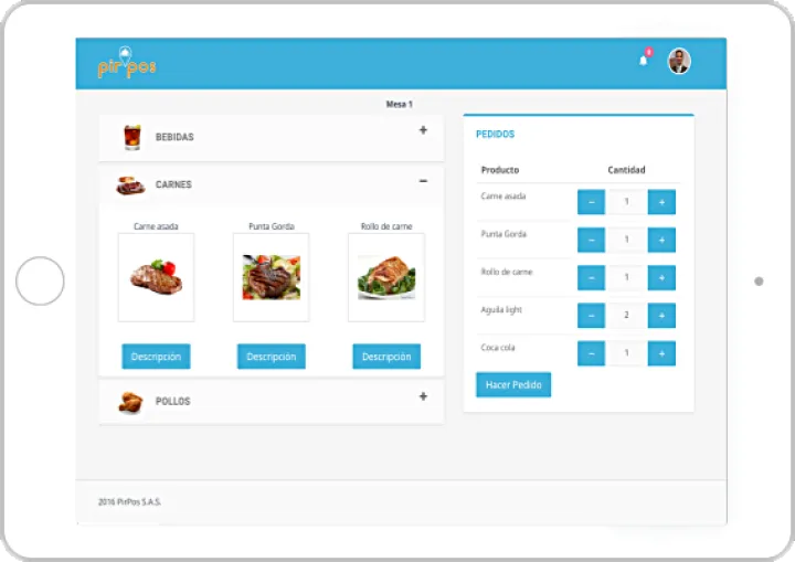 La persona encargada de la caja desde un computador, tablet android o iPad puede observar las mesas ocupadas y disponibles, los pedidos de cada mesa, facturar, dividir cuentas, ver el inventario, hacer pedidos y mucho más.