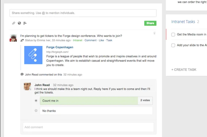 - CONECTA Y COMPARTE CON TODAS LAS PERSONAS DE TU EMPRESA. Usa los flujos de actividad para publicar noticias de la empresa, un calendario compartido para planear eventos, las tareas y archivos compartidos para colaborar dentro de la empresa y la mensajería instantánea del chat como alternativa en tiempo real al email.