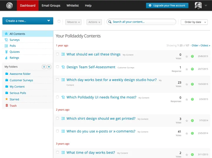 Encuesta a tu manera de crear tus encuestas que coincidan con tu marca , presupuesto y visión por medio de Polldaddy. Crea impresionantes encuestas en línea ilimitadas, con respuestas ilimitadas. Use el editor de encuestas para crear encuestas de manera rápida y fácil. Reúna las respuestas a través de su sitio web, correo electrónico, su dispositivo iOS o a través de cuentas de redes sociales.
