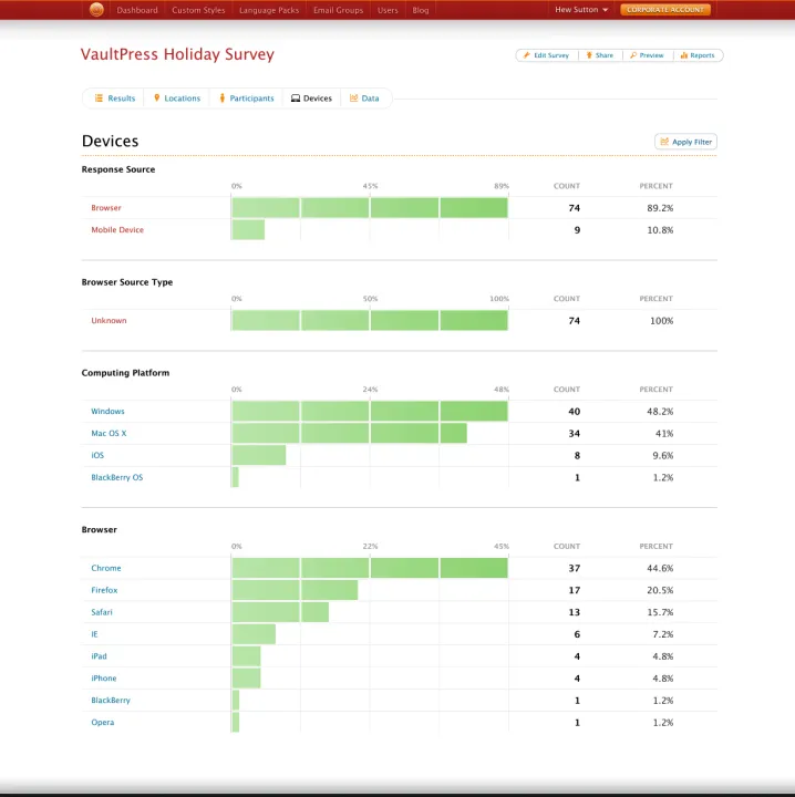 Polldaddy te da potentes Informes y filtrado.Mire sus resultados en tiempo real a medida que entran. Cree filtros para analizar sus datos e informes para compartirlos. Exporte la bondad de los datos brutos a Excel, PDF, CSV, Google Docs y formato XML.