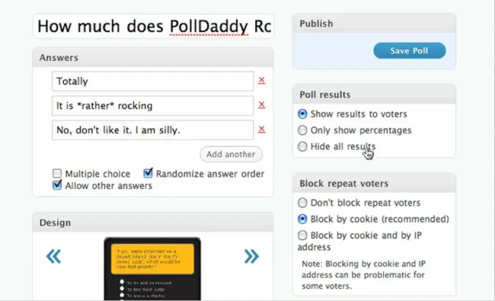 Editor de encuestas de Polldaddy es fácil de usar.Cree encuestas con facilidad utilizando nuestro editor avanzado. Elija entre 14 tipos de preguntas, incluidas la opción múltiple, el texto libre y las escalas de Likert .
