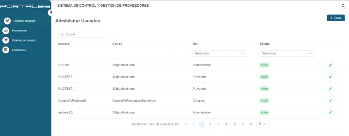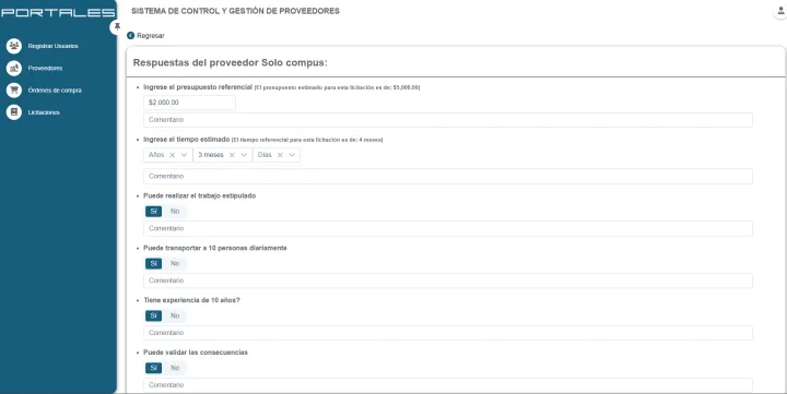 Creación de licitaciones, selección y envío a proveedores, calificación y resultados controlados por la plataforma