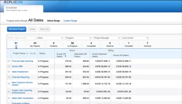 Con Replicon tiene la posibilidad de crear, rastrear y administrar cada uno de sus proyectos empresariales de principio a fin. Logre brindar a su una visibilidad realmente completa de cada una de las métricas del cliente para trabajar de manera más inteligente.