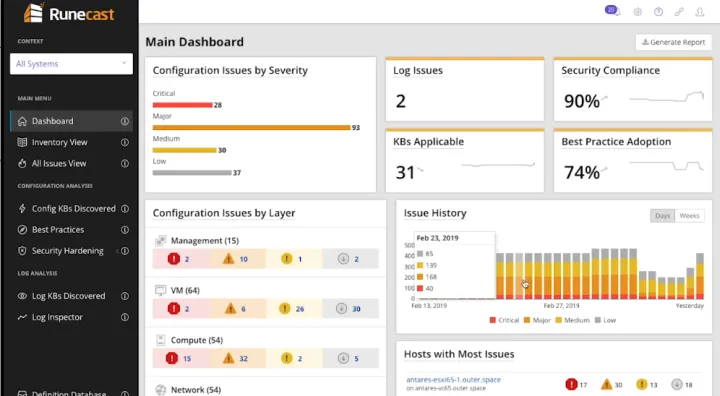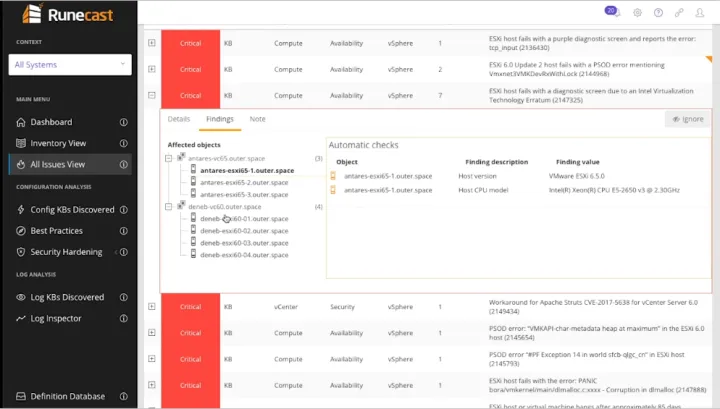 Runecast proporciona un análisis proactivo de buenas prácticas y seguidad en entornos VMware, AWS, Azure, Google Cloud, Kubernetes y sistemas operativos (Linux y Windows) así como en entornos no conectados a la red a través de las siguientes funcionalidades: