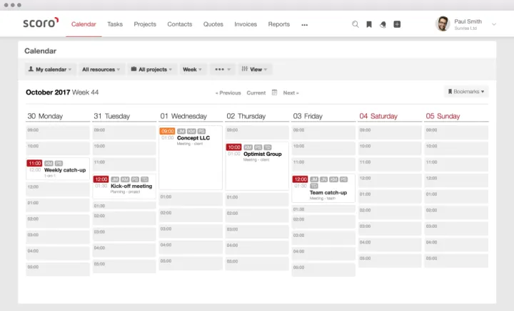 Programe el trabajo y asigne tareas con el Planner de Scoro. Le brinda una visión general instantánea de la carga de trabajo de todos, fechas límite realistas, sobreventa potenciales y espacios disponibles. Programe reuniones en un calendario de equipo compartido y vincule todos los eventos a proyectos y clientes para obtener una descripción completa.