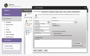 Además, la interfaz guiada por el asistente de Serv-U FTP Server, le permite crear usuarios y grupos a los que se les puede dar acceso al servidor de archivos. Serv-U FTP Server facilita la administración de cuentas de usuario y le muestra todo lo que necesita en el tablero. Serv-U FTP Server es efectivo, accesible y fácil de usar.