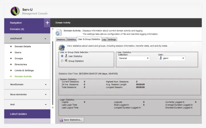 También le permite ver los detalles de transferencias de archivos y le proporciona configuraciones de control, como ancho de banda, almacenamiento, acceso y permisos. Defina límites de sesión simultáneos, bloquee la dirección IP de las sesiones con tiempo de espera, solicite DNS inverso y más.