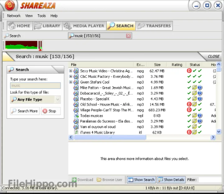 Vista previa, comentarios de usuarios, y calificaciones. Has vista previa de imágenes y películas desde el panel de búsqueda. Hasta ve comentarios y calificaciones escritos por usuarios como tú. Shareaza se asegura que tú no bajes archivos falsos y que descargues los verdaderos.