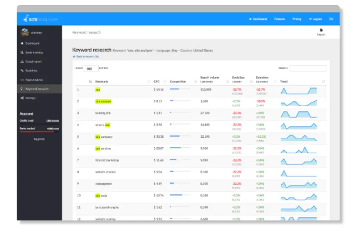 Nuestra plataforma SEO le permite analizar todo su sitio web y revela todos sus productos SEO según nuestra amplia gama de criterios.