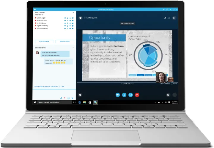 Eficaces herramientas de colaboración para entradas en tiempo real. Graba las reuniones, comparte tu pantalla y haz anotaciones en PowerPoint para lograr una colaboración en tiempo real con hasta 250 personas. Usa pizarras, sondeos, sesiones de preguntas y respuestas, y la mensajería instantánea integrada durante tus reuniones empresariales para que estas sean más productivas.