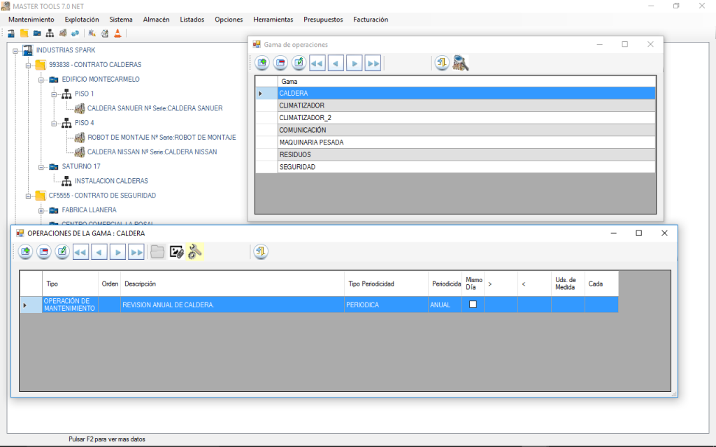 El software cuenta con el seguimiento de los avisos de mantenimiento correctivo, control de partes, de almacén, averías y reparaciones típicas del modelo de máquina. Genera listados de todo tipo, avisos entre fechas, por secciones, por máquinas y por tipo.